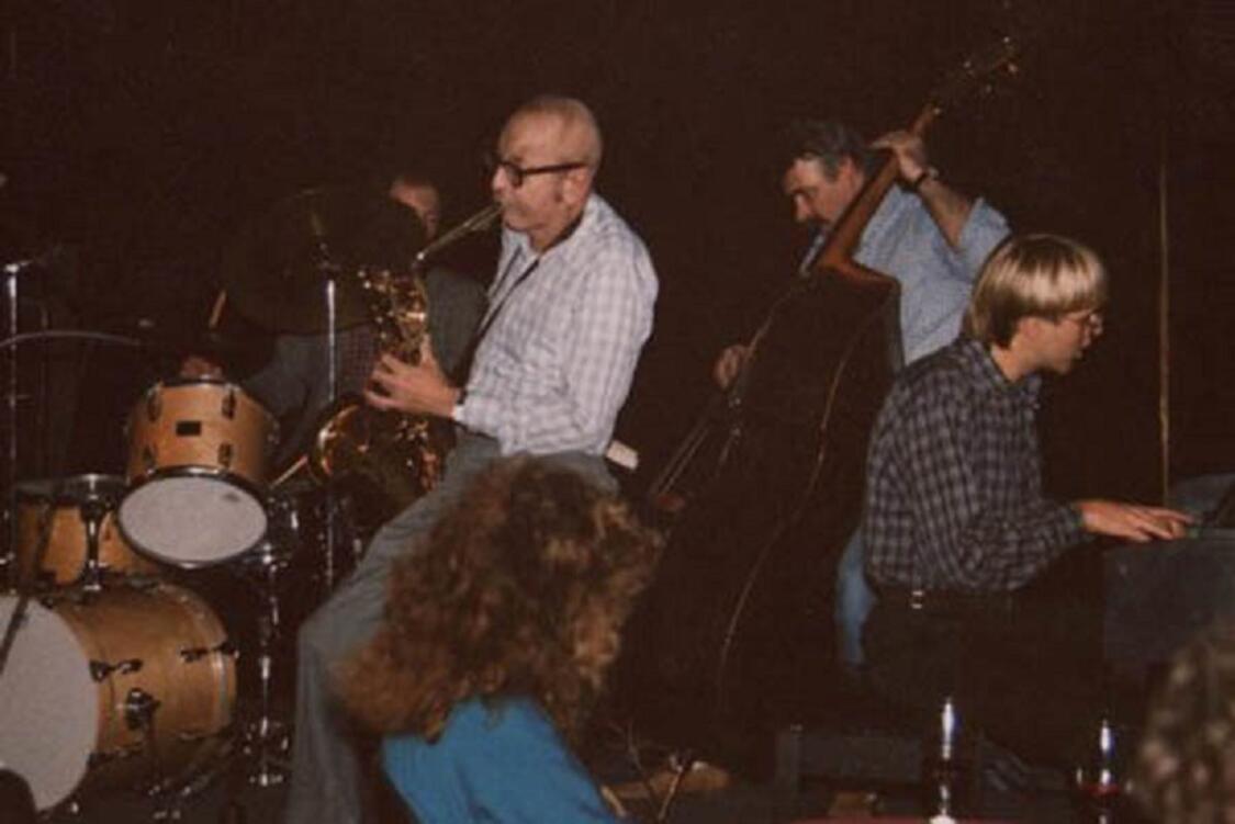 Pepper Adams, Jon Ballantyne (p), Ken Coffey (b), Andy Cree (dm), Bassment, Saskatoon, November 15 or 16, 1985. Photo by Elena Kanigan.